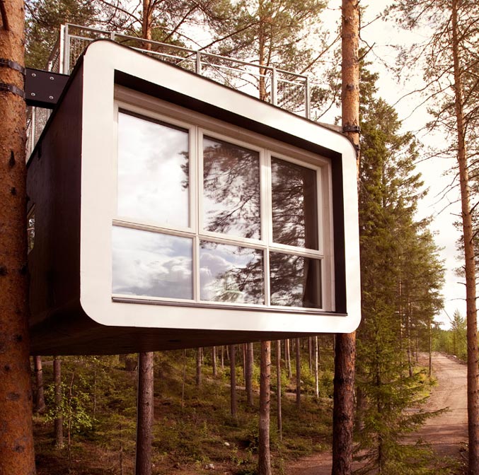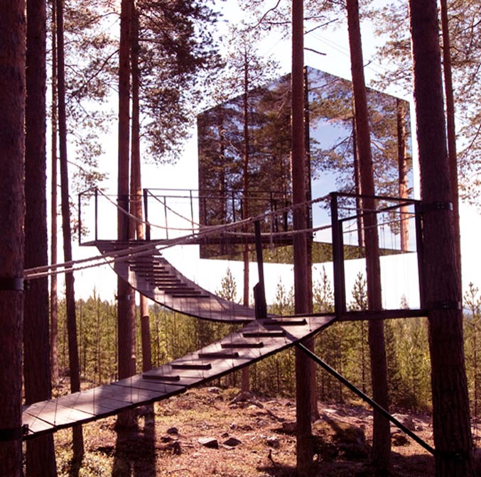 Qui n’a jamais rêvé s’endormir un jour la tête dans les étoiles à quelques kilomètres du cercle polaire Arctique ? Au bout du monde, ou presque, dans le petit village de Harads, en Laponie suédoise, se cachent de chaleureuses cabanes perchées en haut des arbres qui rappellent l’univers de l’enfance où toute magie semble possible. Paysage de Taïga, entre rivières et lacs, on ne peut s’empêcher de garder l’œil ouvert pour tenter d’apercevoir une majestueuse aurore boréale. Conçu comme des nids d’oiseaux, les chambres ont été décorées par les meilleurs designers Suédois. Les cinq cabanes extravagantes se fondent dans l’univers forestier. « The Mirrorcube » est entièrement vitrée et la nature se reflète dans cette cabane-miroir. Accessible par un escalier rétractable, on se retrouve suspendu entre ciel et terre et on profite de la vue imprenable sur la terrasse. L’endroit rêvé pour prendre de la hauteur et découvrir toutes les facettes de la Laponie.