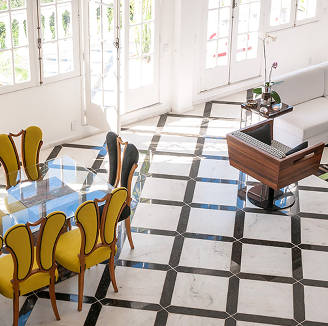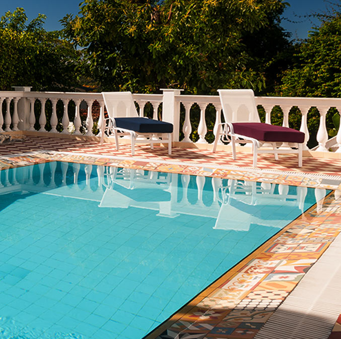 La chambre évoque la jungle amazonienne. Les grandes fenêtres s’ouvrent sur un jardin tropical. Une piscine cernée de carreaux, qui ne sont pas sans rappeler les années 50, se trouve dans ce jardin.